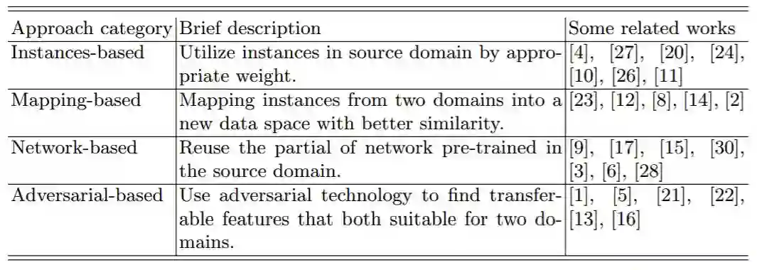 综述 [19] 和 [25] 将迁移学习就源域和目标域之间的关系分为三个主要类别,这已被广泛接受。这些综述是对过去迁移学习工作的总结,它介绍了许多经典的迁移学习方法。