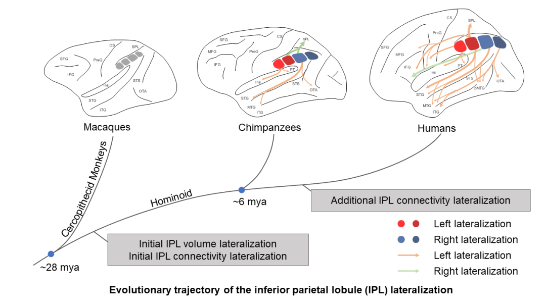 Cheng L., Zhang Y., Li G., Wang J., Sherwood C., Gong G., Fan L., Jiang T. 2021. Connectional asymmetry of the inferior parietal lobule shapes hemispheric specialization in humans, chimpanzees, and rhesus macaques. eLife 10:e67600.
