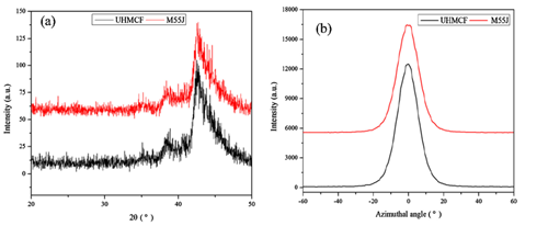 在国产高强高模碳纤维系列化制备技术基础上,特种纤维事业部针对国产M55J级高强高模碳纤维微观结构-宏观性能关联性等领域基础科学问题开展了深入研究,通过纤维截面形貌研究发现,国产M55J高模碳纤维截面呈规则圆形,而东丽M55J碳纤维呈腰形(图1),进一步通过高温石墨化过程中纤维石墨特征结构演变机理研究发现,高模碳纤维拉伸模量与Raman光谱中无序结构D峰、石墨特征结构G峰的半高宽存在一定函数关系,D峰、G峰半高宽值越小,纤维拉伸模量越高;同时,国产M55J碳纤维拉伸强度高达4.86GPa,显著高于东丽M55J碳纤维的4.02GPa,结合该性能差异针对其微观结构研究发现,石墨微晶层间距和微晶取向是影响高模碳纤维拉伸强度的关键因素,国产M55J高模碳纤维与东丽M55J碳纤维石墨微晶层间距相同,但国产M55J高模碳纤维具有更高石墨微晶取向(图2),说明高取向石墨微晶结构有利于高模碳纤维拉伸强度的提高。该系列研究成果发表在Composites Part A: Applied Science and Manufacturing. 2018, 112:111-118;Journal of Raman Spectroscopy,2019,doi.org/10.1002/jrs.5569等期刊上。