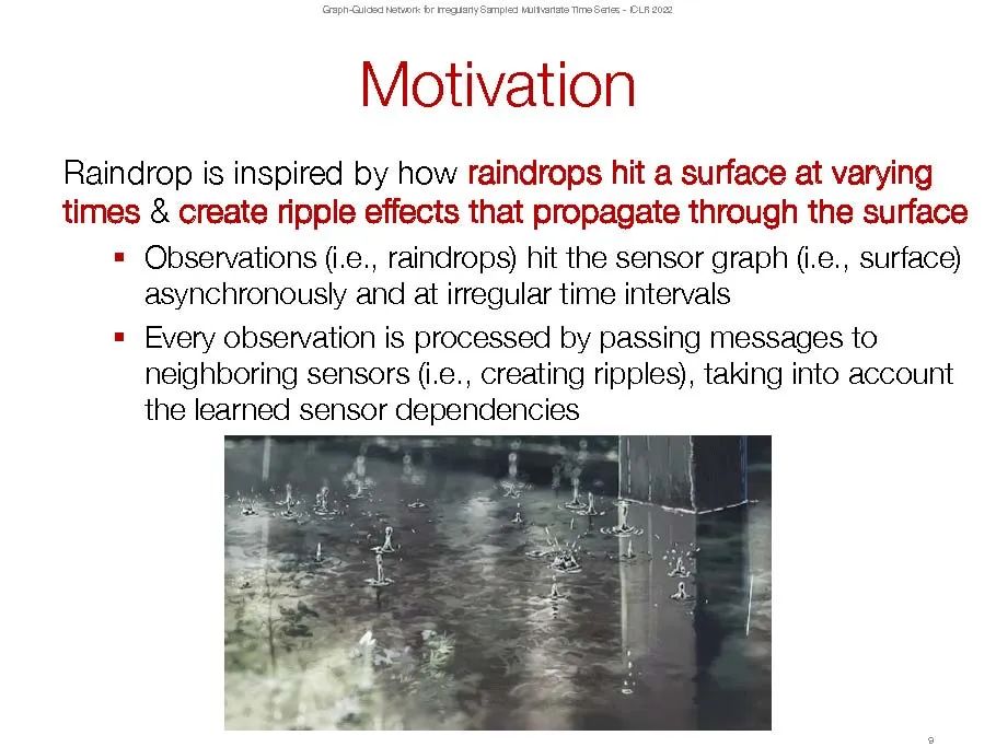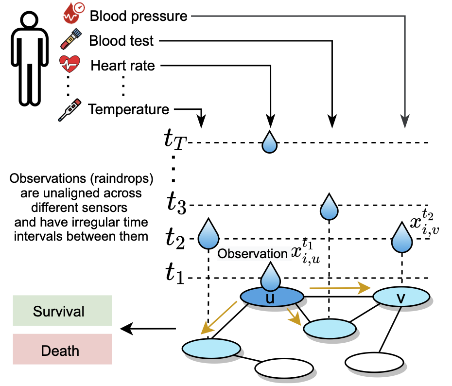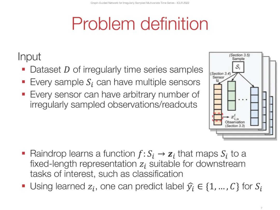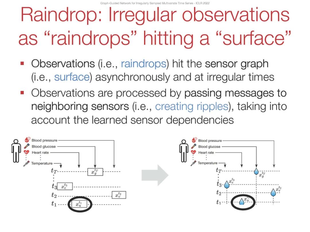 我们介绍Raindrop,一个图神经网络,学习嵌入不规则采样和多元时间序列,同时学习传感器的动态纯粹从观察数据。Raindrop可以处理不对齐的观测、变化的时间间隔、任意数量的观测,从而通过神经信息传递和时间自注意力产生固定维嵌入。