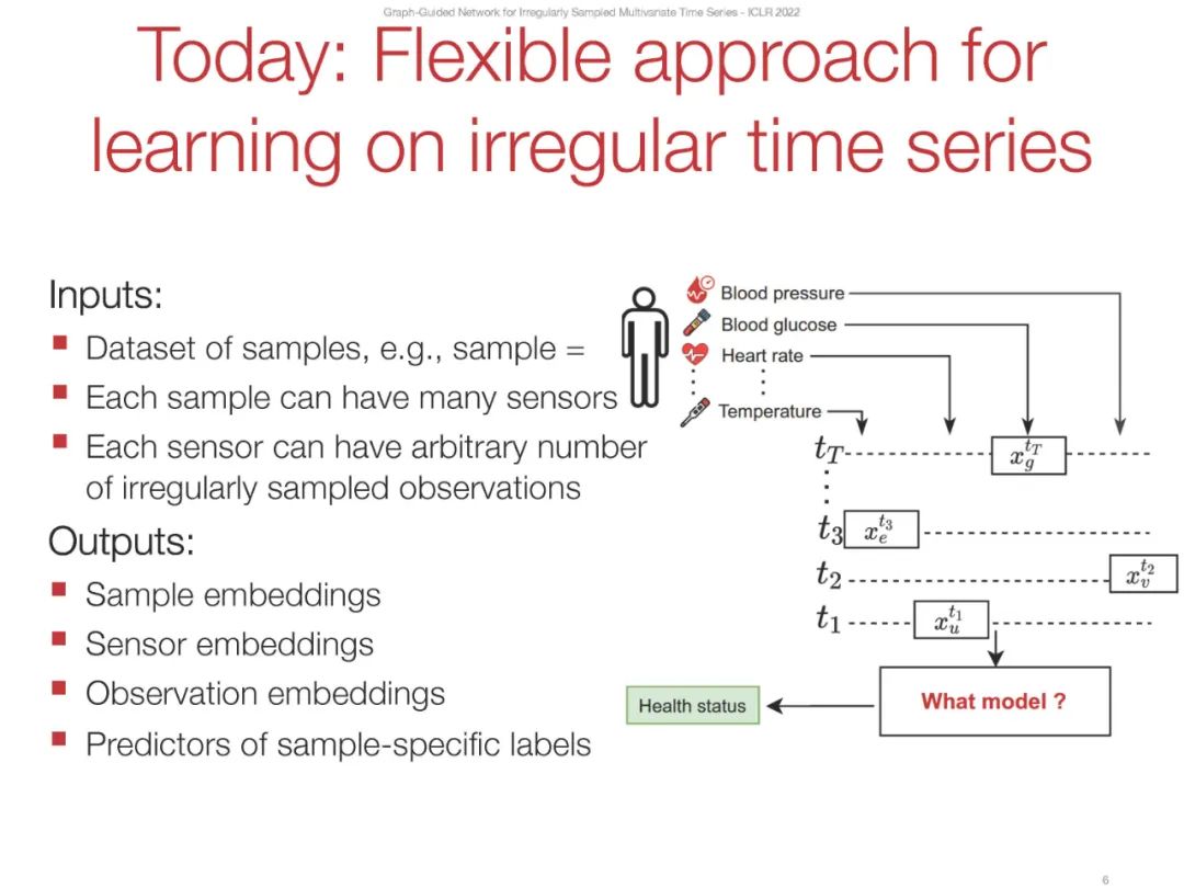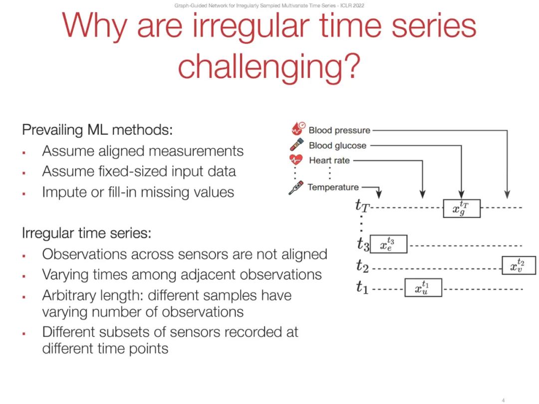 在许多领域,包括医疗保健、生物和气候科学,时间序列是不规则的采样,连续读数之间的时间间隔不同,不同的变量子集(传感器)在不同的时间点观测。在收集传感器测量数据时,经常存在一些实际问题,这些问题会导致各种类型的不正常现象,例如成本节约、传感器故障、物理场景中的外部力量、医疗干预等等。