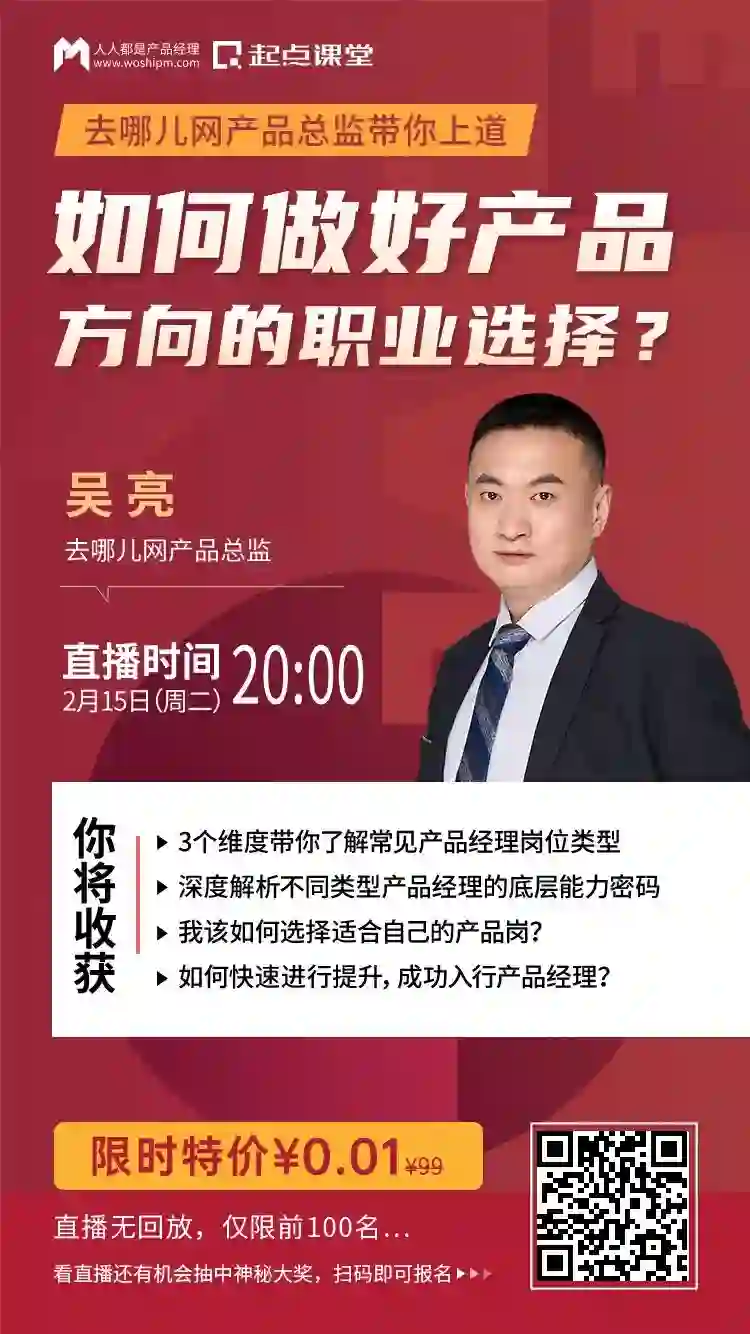 02月15日(周二)晚上20:00 去哪儿网产品总监@吴亮 将会上线为大家带来满满干货的直播课程哦!