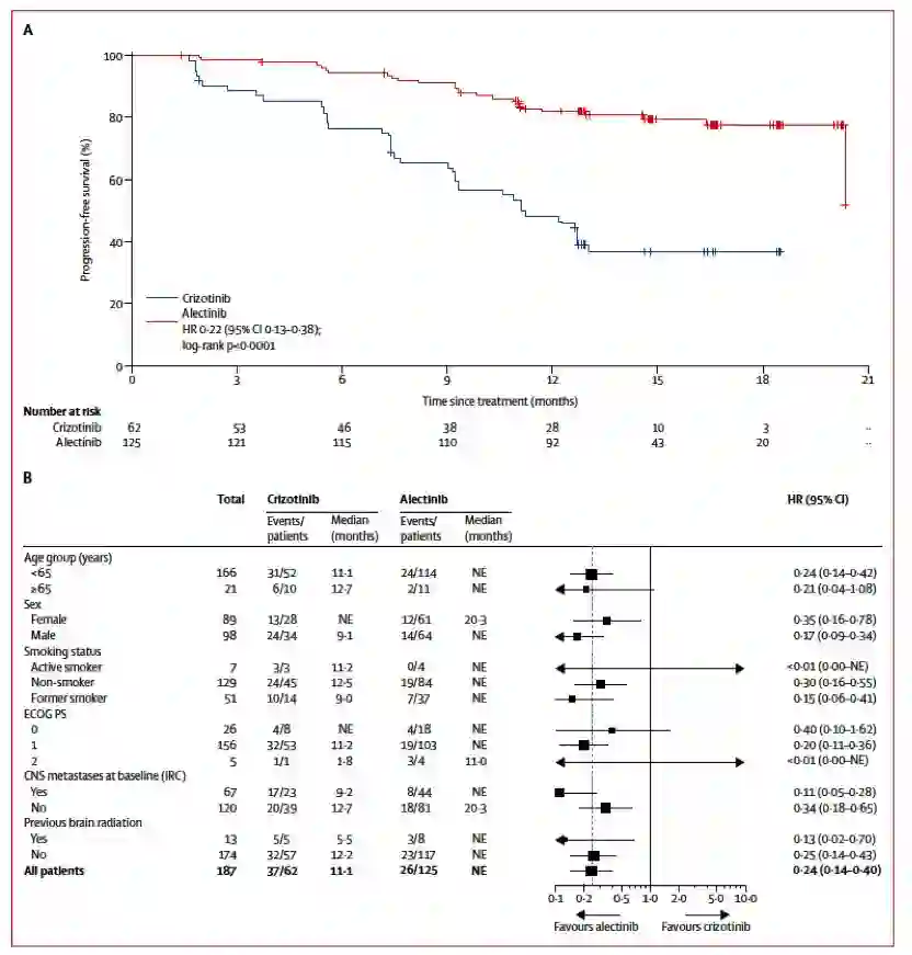 2016年8月3日至2017年5月16日,共187例患者参与随机,其中125例患者分配接受阿来替尼治疗,62例接受克唑替尼治疗。阿来替尼组和克唑替尼组的中位随访时间分别为16.2个月(IQR 13.7~17.6个月)和15.0个月(IQR 12.5~17.3个月)。研究者评估的PFS显示,阿来替尼组显著优于克唑替尼组(HR=0.22, 95% CI 0.13~0.38; P<0.0001),中位PFS分别为NR 和11.1个月。独立评估委员会评估的PFS也观察到阿来替尼组显著优于克唑替尼组(HR=0.37, 95% CI 0.22~0.61; P<0.0001)。PFS亚组分析观察到与总体人群一致的结果,其中基线合并CNS转移的患者,从阿来替尼组治疗中获益更显著(HR=0.11, 95%CI 0.05~0.28)。