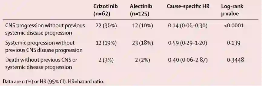 阿来替尼组中,获得客观缓解的患者占91%(114/125),克唑替尼组占77%(48/62),两组的DOR对比显示阿来替尼组也显著优于克唑替尼组,mDOR 分别为NR和9.3个月(HR=0.22, 95% CI 0.12~0.40; P<0.0001。此外,阿来替尼对比克唑替尼还可以显著降低至CNS进展风险,HR=0.14(95%CI 0.06~0.30);在基线合并可测量或不可测量CNS病灶的患者中,阿来替尼组取得CNS客观缓解的患者比例更高,两组分别为73%(32/44)和22%(5/23)。