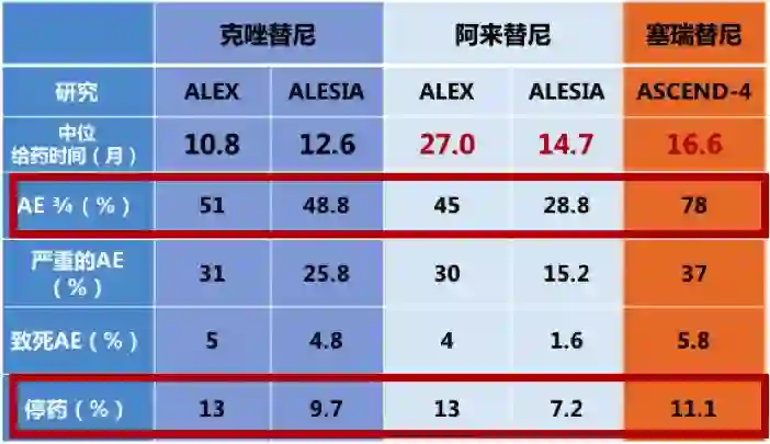 最后,从安全性角度而言,在ALEX研究中,阿来替尼对比克唑替尼显示出更优的安全性,即使中位给药时间最长,但3~4度不良事件(AE)和停药的患者比例更低。而在ASCEND-4研究中,塞瑞替尼的安全性甚至差于化疗,因不良反应事件导致剂量调整和中断的患者比例较高。3个药物的安全性对比总结见表3,在整体耐受性评估上,阿来替尼作为使用最长的药物,具有更优异的安全性。