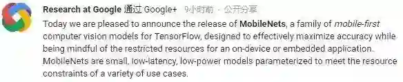 【谷歌开源计算机视觉模型MobileNets:专为不同级别移动设备优化】http://t.cn/RSFt5pO 谷歌刚刚对外发布了开源计算机视觉模型MobileNets。MobileNets是一系列为移动和嵌入式设备设计的计算机视觉模型,它可以利用设备有限的资源高效运行,并提供尽可能高的准确率。
