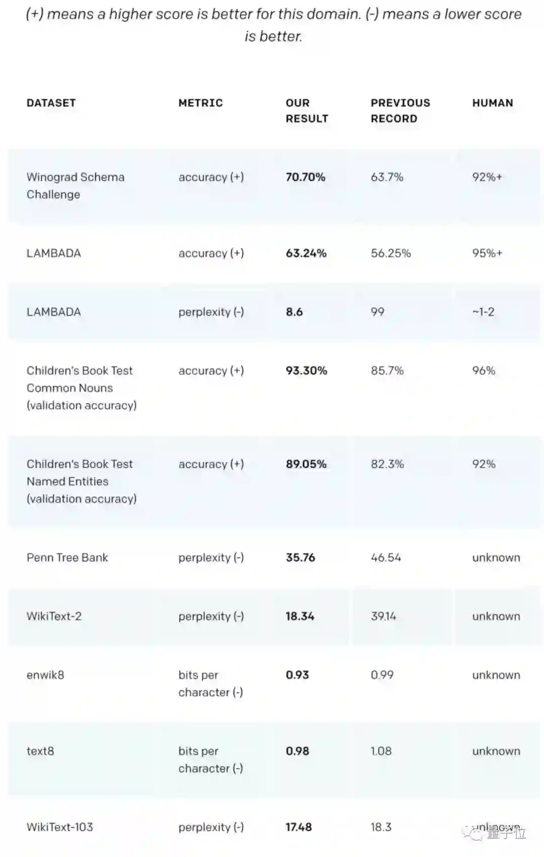 作为一个没有经过任何领域数据专门训练的模型,它的表现比那些专为特定领域打造的模型还要好,横扫各大语言建模任务。