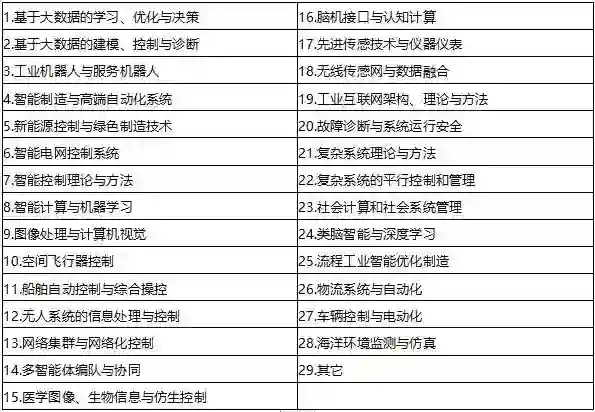 本次大会将设立8个专题、29个征文领域。热忱欢迎全国各高等院校、科研院所和企事业单位中从事自动化、仪器仪表、智能制造、信息与智能科学理论与技术研究的科技工作者积极投稿,特别希望征集能反映各单位研究特色的学术论文。各专题除特邀报告外,将从投稿中遴选优秀论文做专题会场报告。