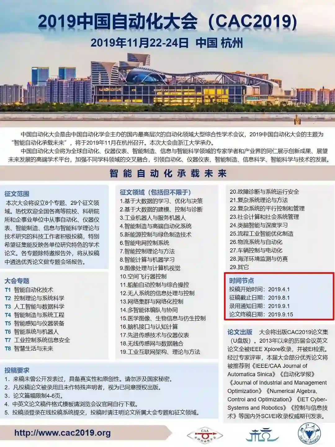 【导读】中国自动化大会是由中国自动化学会主办的国内最高层次的自动化领域大型综合性学术会议,2019中国自动化大会的主题为“智能自动化承载未来”,将于2019年11月22-24日在杭州召开。本次大会由浙江大学承办。应广大作者要求,现征稿截止时间延至2019年8月1日,请各位投稿人周知,欢迎踊跃投稿。