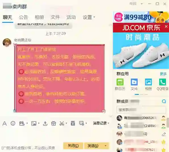 互联网群组中,毒贩们大都采用暗语进行交易,根据小雷的介绍,记者混入了一个代号为“纯净卖肉群”的QQ群,这个群成立于今年7月,群成员150人左右。群主会在群内不定时地吆喝他的“商品”,并强调不接受“货到付款”,而所谓商品就是冰毒,在他的描述中,好像出售的只是一件普通商品。