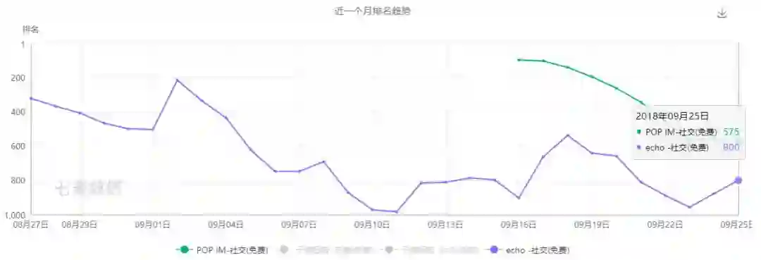 上图是两款“社交新贵”产品的App Store的排名曲线,分别是上线了一个月时间的echo和上线10天的POP。
