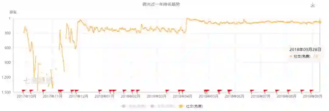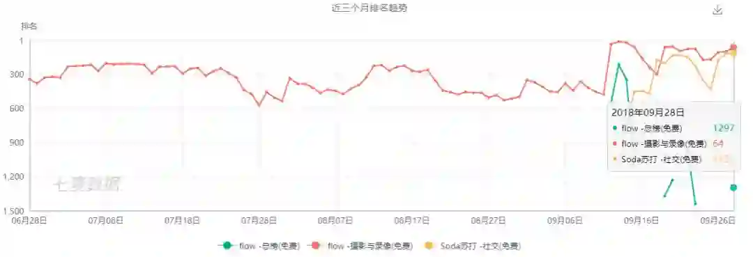 我们依旧来看看增长情况。flow把自己分在摄影与录像的分类中。不过按照我的经验,横向对比摄影榜和社交榜的排名,两者的排名要求其实接近。也就是说摄影榜的64位和社交榜的64位的单日下载量基本差不多。flow大概目前比soda单日新增多个1k不到吧。
