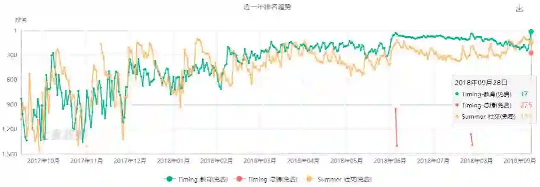 Timing把自己分在了教育榜。其实Timing的数据之前就还不错(最近融完资似乎搞投放了嘛)。