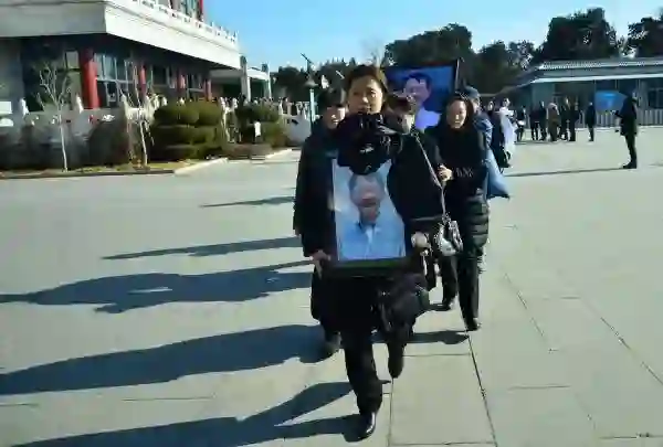 2015年1月16日北京,“布鞋院士”李小文追悼会在八宝山殡仪馆举行,他的女儿带着遗像走向焚烧处