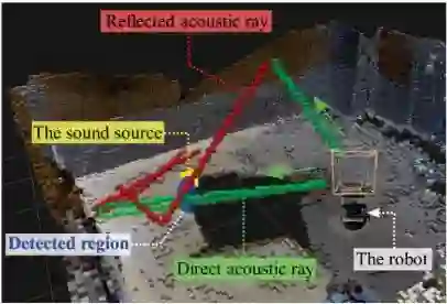 第一篇文章提出了一种新型的用于室内环境中的3D声源的反射定位的方法。与现有方法不同,现有方法主要基于来自固定源的连续声音信号,本方法设计从单帧信号中定位即时位置。我们考虑了经过如天花板或墙面等表面反射后到达麦克风的直接或间接的声音信号。然后使用逆声线追踪生成并跟踪直接或反射的声波路径,通过蒙特卡洛定位方法利用这些路径来估计3D声源的位置。我们将该方法应用于一个配备了立方体形状的麦克风阵列的机器人上,并在固定和移动的声源下在连续的和间隙的声音信号下进行了不同设置的测试。在不同的设置下,该方法能在7m×7m×3m的室内测试环境下定位声源,平均距离误差为0.8m,包括移动和非视距声源。我们也发现,在加入对间接射线的建模能比仅用直接射线的建模方法提高40%的定位精度。