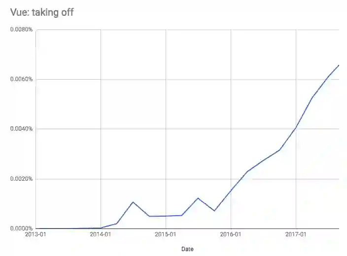Vue 的增长速度也非常快,受欢迎程度与 Ember,Angular 和 Backbone 旗鼓相当