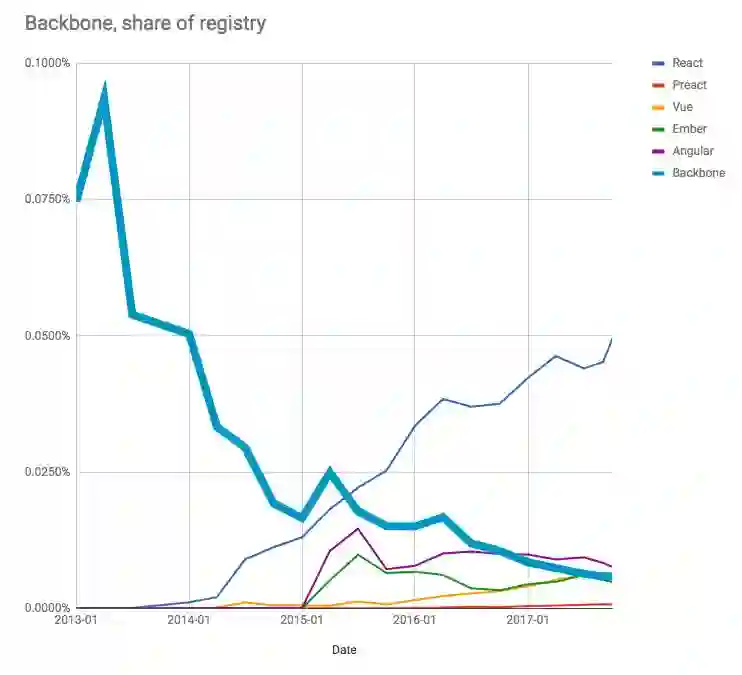 对于老牌框架 Backbone,在 5 年前占主导地位的它自此以来,就一直在急剧下降,但由于现有项目的长期“保质期”,开发者还未能完全抛弃它,基本上仍有每月 75 万次的下载量。