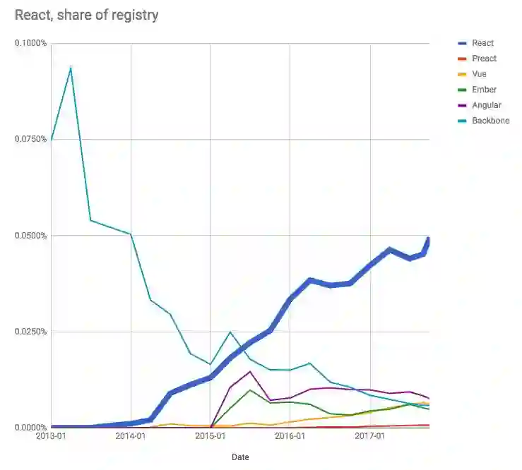 报告显示,相对于所有 npm 中的包下载量,React 的使用量增长了 500%。移动、桌面应用程序和 Web 开发都在使用 React。对 React 而言,作为它的性能改进直接替代品,Preact 也有 145% 的增长。