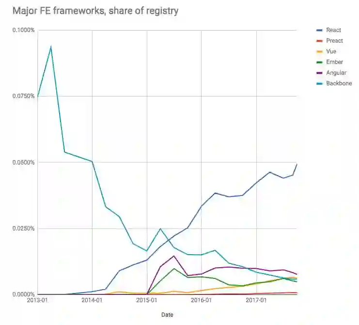 该图显示了 2016 年 10 月至 2017 年 10 月这 12 个月期间框架的受欢迎程度及其增长情况。总体情况很明显: