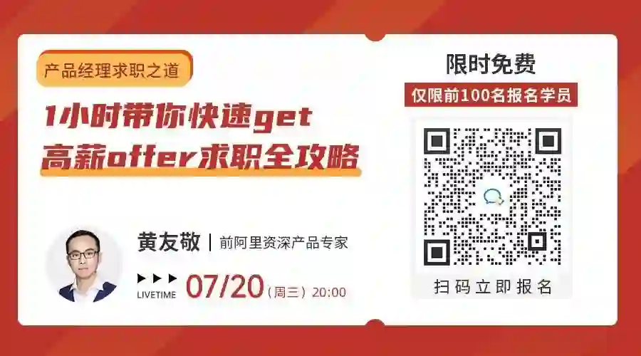下周四(7月20日)晚8点,前阿里高级产品专家@黄友敬老师,将用1小时带你快速get高薪offer求职全攻略,他会站在面试官的角度多维度剖析产品求职难题,破解面试官问题背后的“套路”,助你顺利拿到offer!