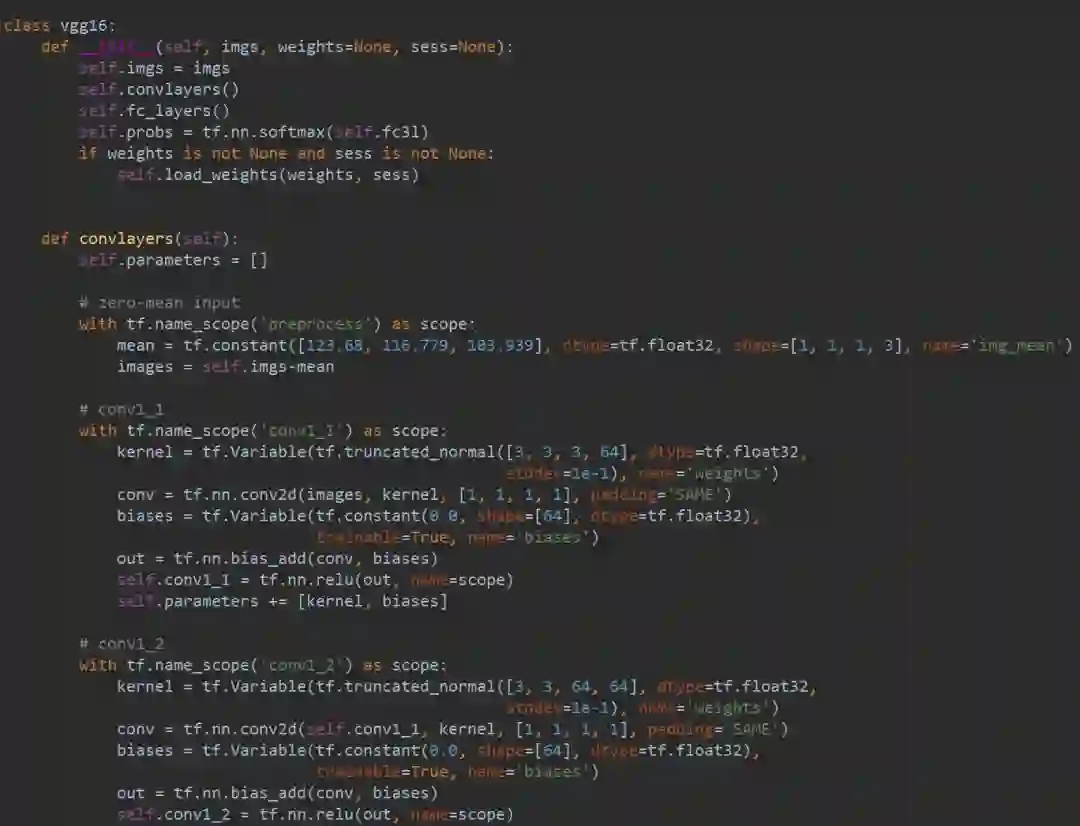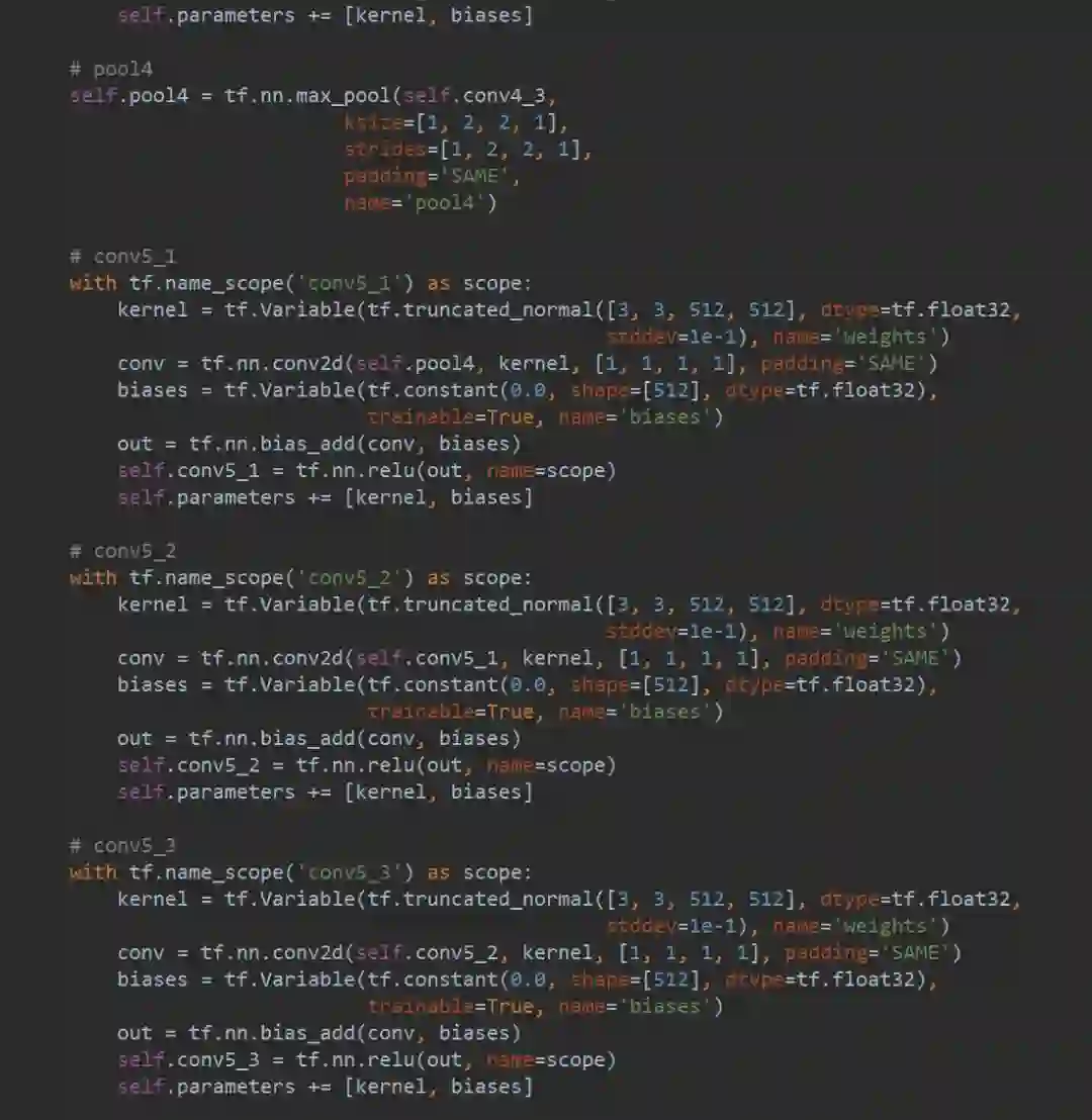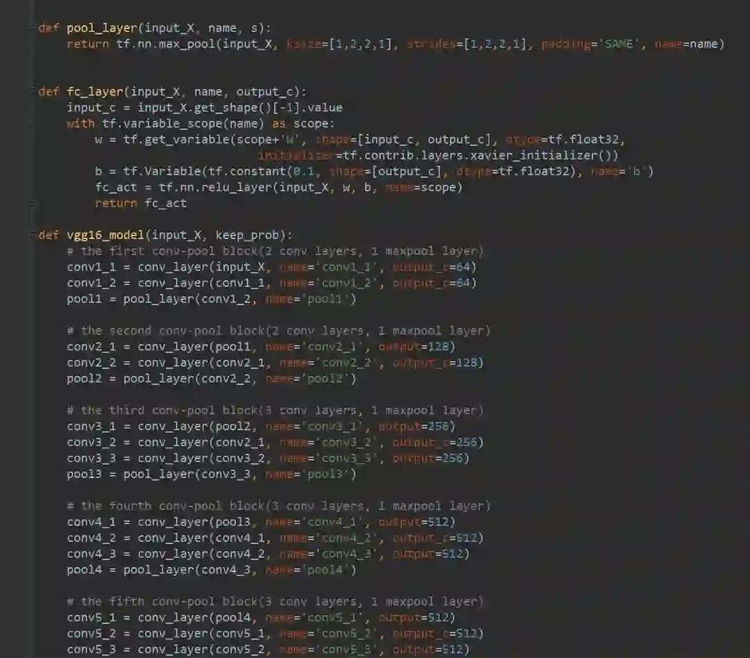 原本自己利用 Tensoflow 简单写了个 VGG16 的网络结构,但去谷歌一搜发现别人的代码写的实在太好了,以至于这里就不用自己代码展示 VGG16 了。编写的思路无非就是定义卷积过程、池化过程和全连接过程,然后将其封装到 VGG16 的模型函数中去,其中注意一些编写细节即可。