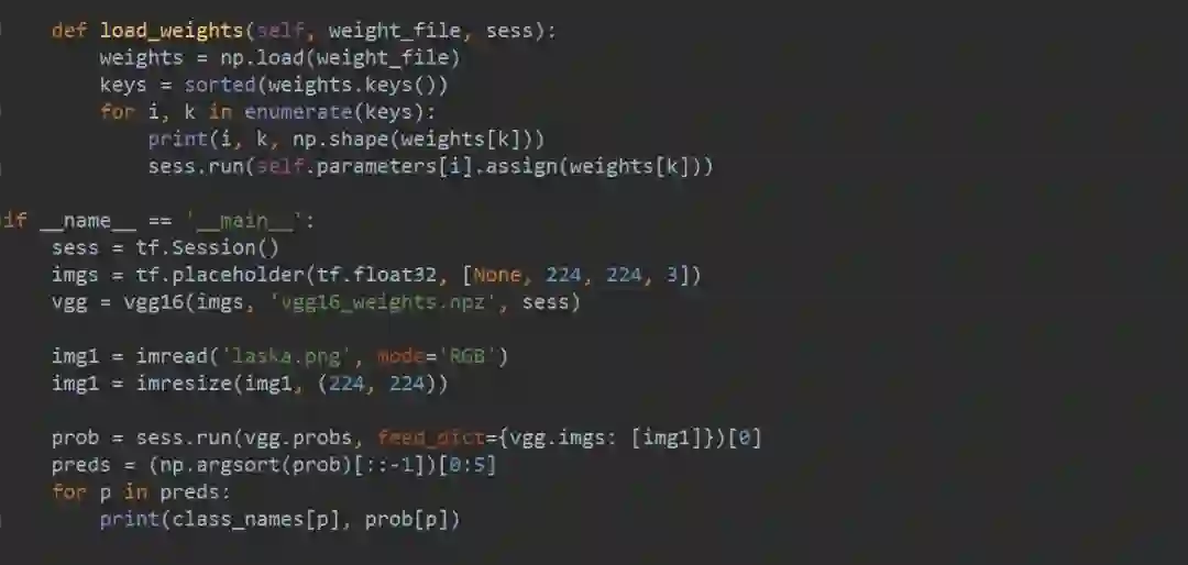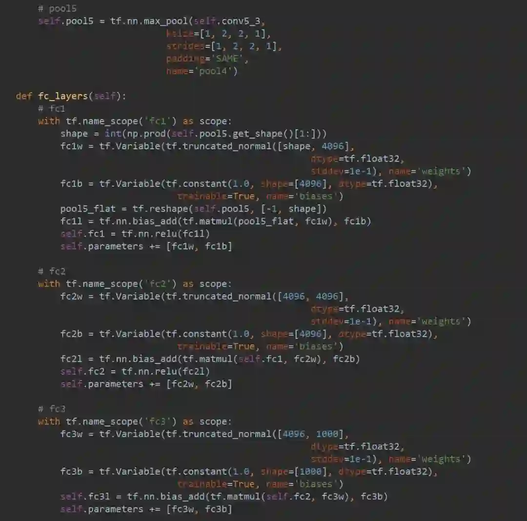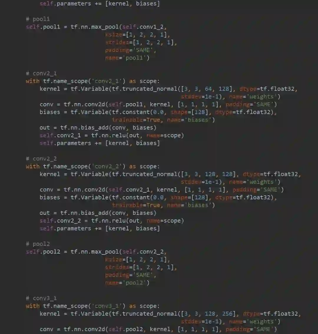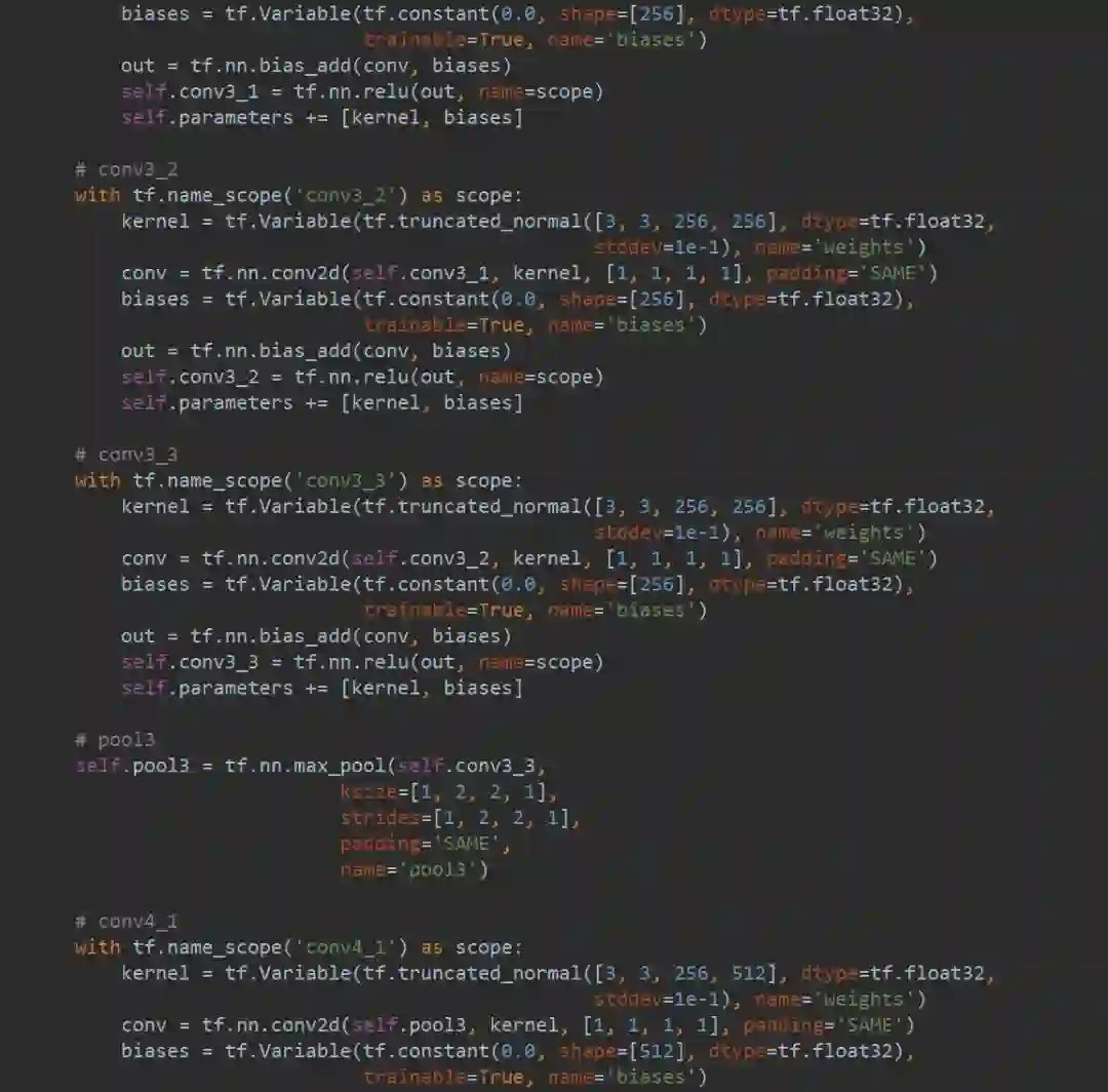 原本自己利用 Tensoflow 简单写了个 VGG16 的网络结构,但去谷歌一搜发现别人的代码写的实在太好了,以至于这里就不用自己代码展示 VGG16 了。编写的思路无非就是定义卷积过程、池化过程和全连接过程,然后将其封装到 VGG16 的模型函数中去,其中注意一些编写细节即可。
