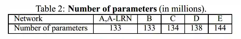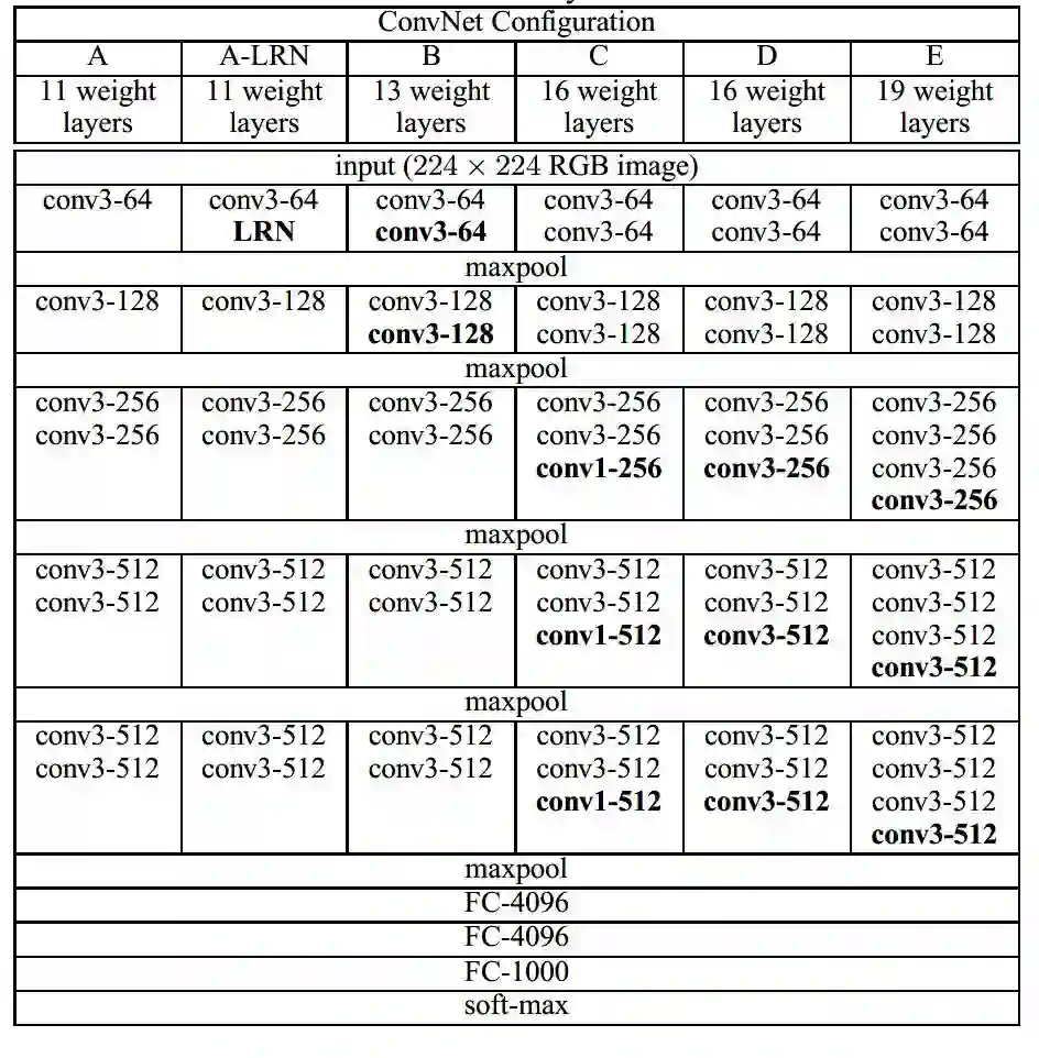 在论文中,作者使用了 A-E 五个不同深度水平的卷积网络进行试验,从A到E网络深度不断加深: