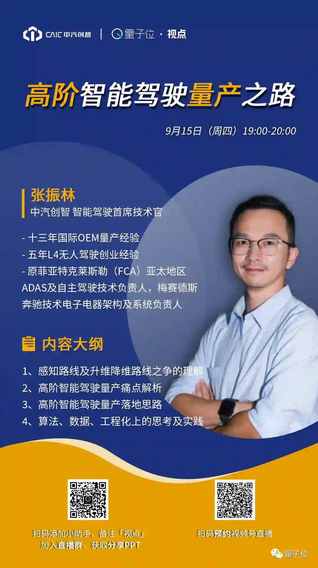 9月15日,量子位发起的「量子位·视点」CEO/CTO系列分享活动邀请了中汽创智智能驾驶首席技术官张振林,将围绕高阶智能驾驶量产的路线、痛点、落地等分享思考与实践。