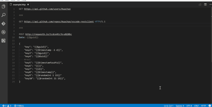 如果你是构建 REST API 的开发人员,那么这是 Visual Studio Code 环境中必须安装的扩展。有了它,你能够编辑包含 HTTP 调用的 .http 文件。编辑器将提供快速的代码片段和模板,它会在你点击后提供神奇的超链接,还会触发 HTTP 调用并在其旁边打开结果。如下图所示: