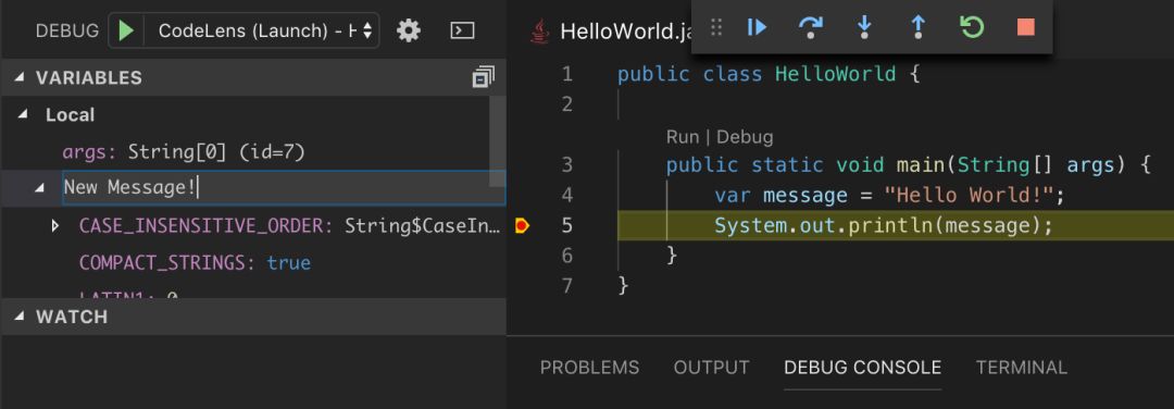 安装此扩展之后,如上图所示,你会发现 main 方法上方有两个超链接,分别是 Run 和 Debug。点击“Run”,代码将被编译和执行。你还可以点击 Debug 并设置断点进行调试。