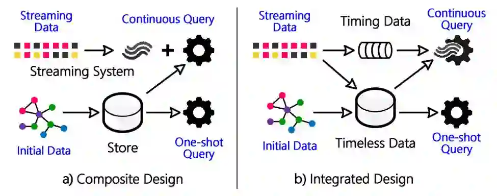 传统流式处理与数据库系统(左)与Wukong+S(右)的比较 (图片来源:Stateful Stream Querying over Fast-evolving Linked Data, SOSP’17)