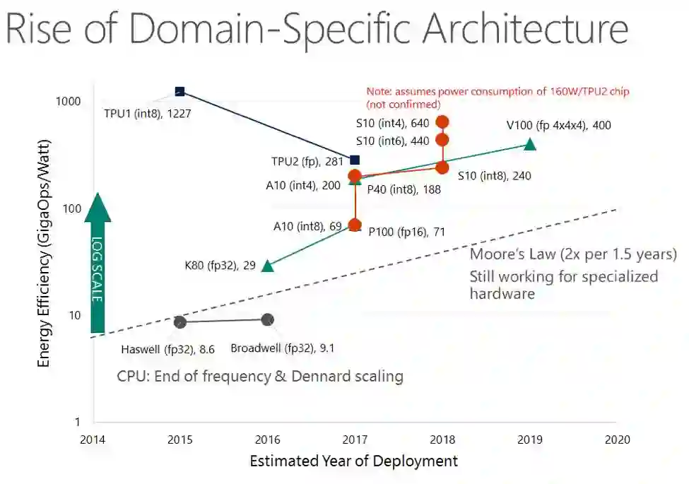 摩尔定律对CPU而言基本上终结了,但对GPU、FPGA、TPU等定制化硬件而言仍在继续