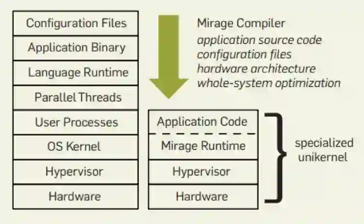 为应用定制的Unikernel (右) 与Linux (左) 的比较(图片来源:Unikernels: The Rise of the Virtual Library Operating System, ACMQueue, Jan. 2014)