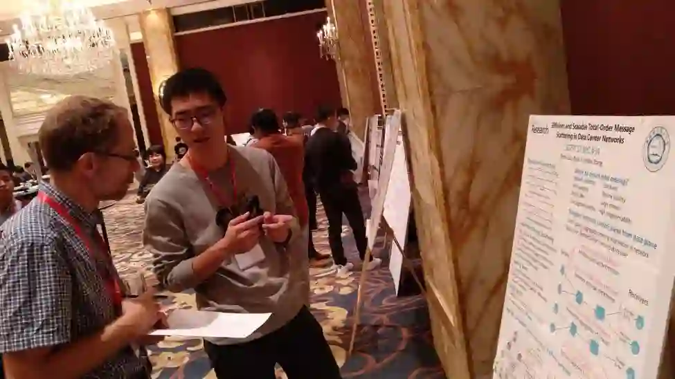 微软亚洲研究院实习生左格非在SOSP学生研究竞赛(SRC)上向SIGOPS主席Robbert van Renesse教授展示研究成果,该成果获得本科生组银牌。