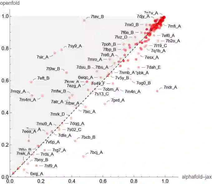 OpenFold 与原版 AlphaFold2 的准确率相当,甚至略胜一筹,可能因为 OpenFold 的训练集更大一点: