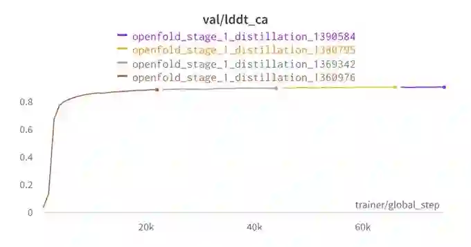 无论是否有 DeepSpeed,OpenFold 都能以全精度或 bfloat16 进行训练。为了实现 AlphaFold2 的原始性能,该团队从头开始训练 OpenFold,现已公开发布了模型权重和训练数据。其中,训练数据包含大约 400000 份 MSA 和 PDB70 模板文件。OpenFold 还支持使用 AlphaFold 的官方参数进行蛋白质推理。