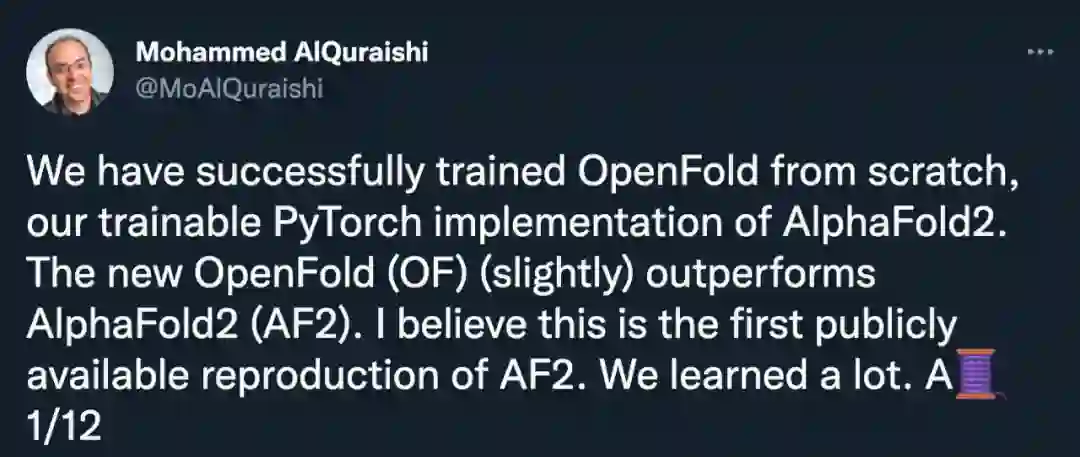 刚刚,哥伦比亚大学系统生物学助理教授 Mohammed AlQuraishi 在推特上宣布,他们从头训练了一个名为 OpenFold 的模型,该模型是 AlphaFold2 的可训练 PyTorch 复现版本。Mohammed AlQuraishi 还表示,这是第一个大众可用的 AlphaFold2 复现。