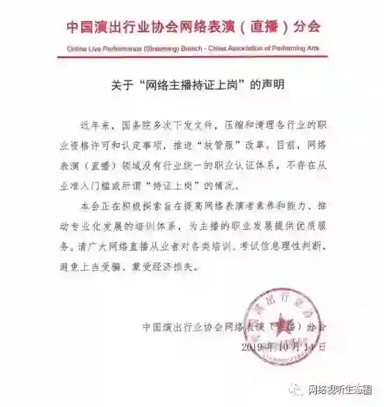 此前媒体报道的“网络主播持证上岗”一事,中国演出行业协会今天回复:目前,网络表演(直播)领域没有行业统一的职业认证体系,不存在从业准入门槛或所谓“持证上岗”的情况。