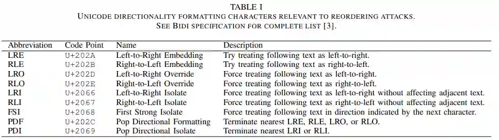 相互嵌入多层 LRI 和 RLI,可以近乎任意地重新排序字符串。那么攻击者就可以将杂乱的字符,经过这种方式,将自己想要的功能插入到当前的开源项目中,让用户下载后执行,从而在不知情的情况下来执行漏洞代码。