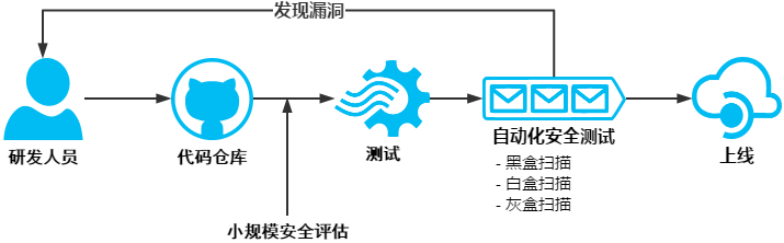 在百度,我们将这种方式称之为轻量级 SDL,即通过少量的人力投入,以高自动化、高 CI/CD 集成的方式解决业务产品的安全问题。在轻量级 SDL 建设初期,我们根据实际业务场景,构建了百度的自动化漏洞检测系统,并将其嵌入到业务测试上线流程中,具体图示如下: