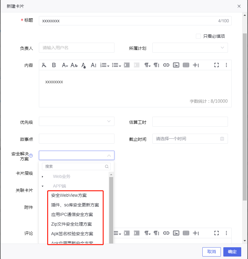 同时将其集成到百度工程规范指定的需求管理产品 iCafe(对外版本)中。当业务线研发人员、PM 创建需求卡片时,可以根据自身的业务场景选择对应的安全解决方案,并在研发前完成规范、安全方案的学习,从而在研发编码阶段尽可能避免这些问题。