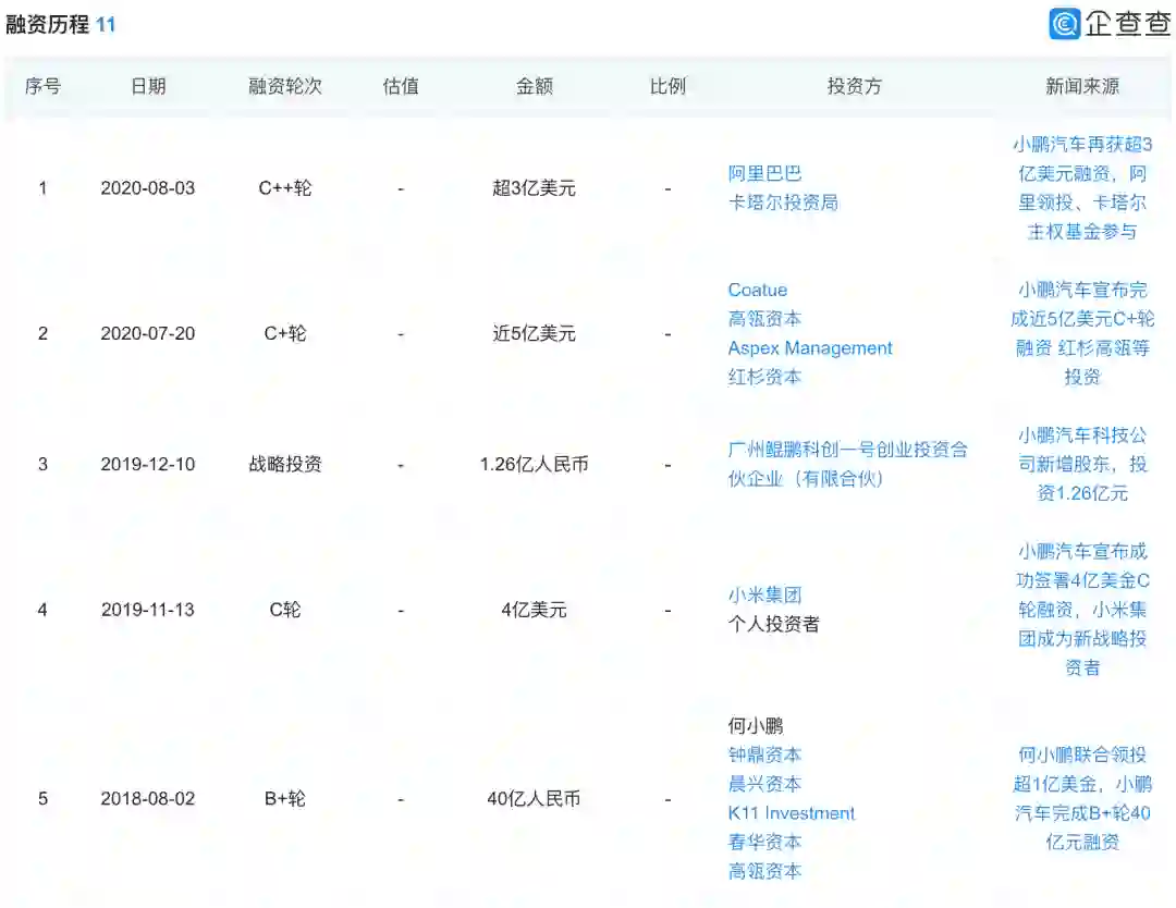 例如在今年7、8月进行的C+和C++轮融资中,小鹏汽车公募集资金近9亿美元,投资方就有阿里巴巴、高瓴资本和红杉中国等,投后估值为80亿美元。去年11月,小鹏汽车C轮融资4亿美金,引入战略投资小米集团。