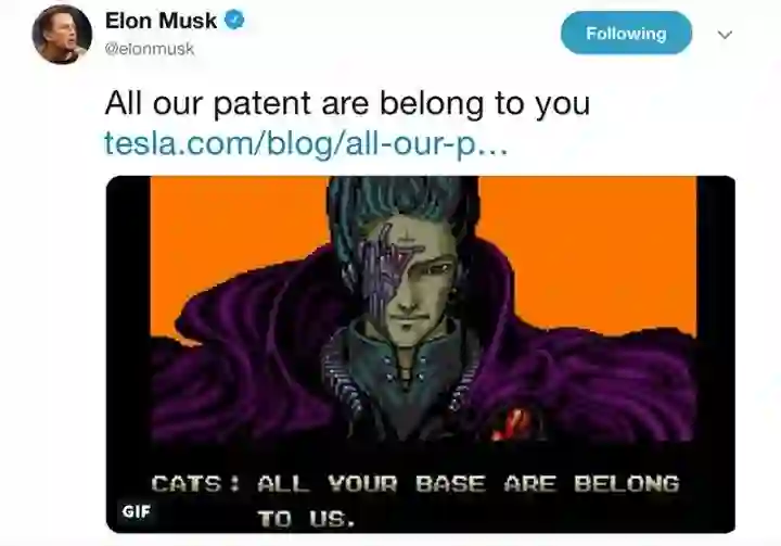 马斯克宣布对外开放特斯拉所有专利(来源:twitter)