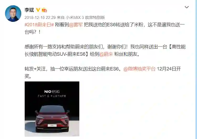 2018年蔚来ES6上市时,雷军站台并抽奖送米粉ES6,直接将自己和蔚来送上热搜。
