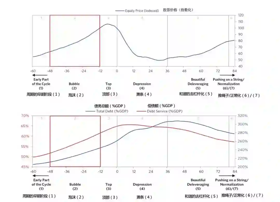在泡沫期就可以看到股价在上升,这是整体的债务情况,我们可以看到股价的上升,然后到泡沫见顶的时候就看到收紧。