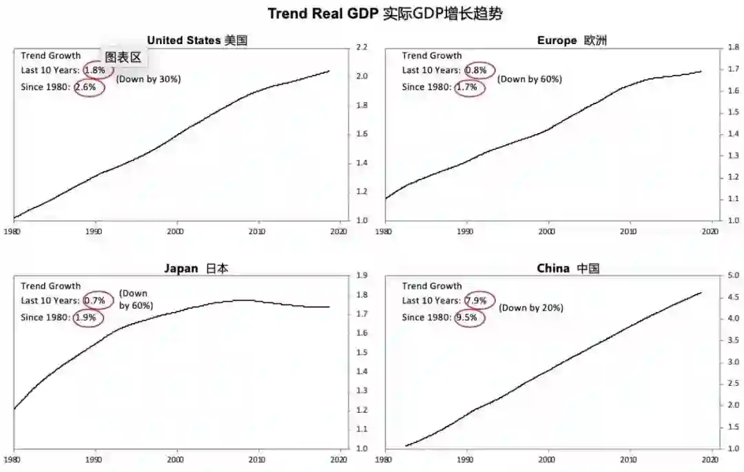 这是美国过去10年的生产效率。从20世纪80年代开始的生产效率的变化,欧洲的生产效率在下降,下降了60%,从0.6到1.8。日本的生产效率在下降,它的债务危机在发展,社会进入老龄化。
