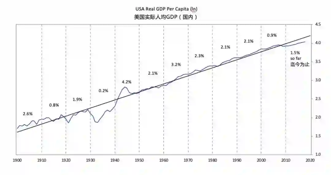 我给大家介绍几个图表,这个线是美国从1990年开始的人均GDP,我们可以看到这个上段线条力量是非常大的,它会有波动,但是这些波动、这个周期是非常长期的。