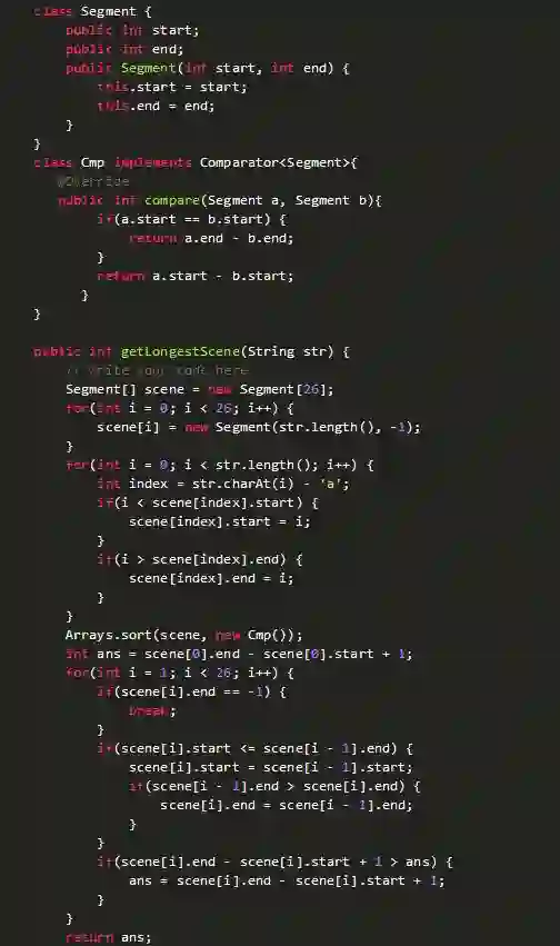 题目描述:一个字符串,每个字符表示一个场景。两个相同字符之间认为是一个连续的场景。例如:abcda,可以认为这五个字符是同一个场景。或者acafghbeb可以认为又aca和beb两个场景。场景之间有重合那么就把场景合起来,例如abcab,这里abca和bcab是重合的,那么认为这五个字符是同一个场景。给一个字符串,求最长场景。