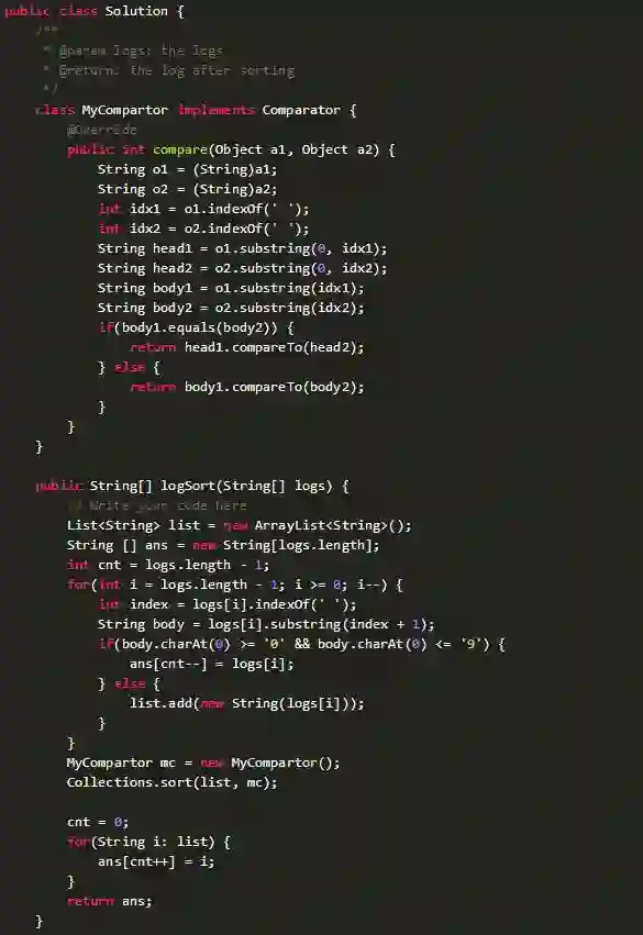 题目描述:给一个日志,由List< String >组成,每个元素代表一行日志。每行日志的信息用一个空格分开。最前面的是日志的ID,后面是日志的内容,内容要么是全部由字母和空格组成,要么是全部由数字和空格组成。现在将日志进行排序,要求字母内容按照内容字典序排序放在顶部,数字内容放到底部且按照输入顺序输出。(注意,空格也属于内容,并且当字母内容字典序相等时,按照日志ID字典序排序,保证ID都不重复)