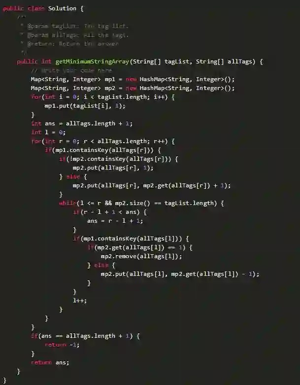 题目描述:给定一个字符串集合tag_list,一个字符串数组all_tags。请寻找最小的all_tags子数组包含tag_list中的所有字符串,输出这个子数组的长度。如果不存在返回-1。
